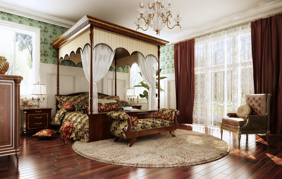 古典歐式風(fēng)格的臥室,超強的奢華感充斥著整間房間,造型別致古樸的吊燈,霸氣高雅的歐式床幔設(shè)計,基色黃色黑色花紋的床上用品和紅色保證,盡顯貴氣,加之床邊的床尾凳,又為這間臥室增添了不少高貴的氣度。深棕色的實木地板,色澤純正,表面光滑有質(zhì)感。古典歐式風(fēng)格,追求空間上的連續(xù)性,整件臥室,從上至下,無論是床幔支架的顏色,還是窗簾的顏色,亦或是家具和地板的顏色,整體色彩的連接都非常恰當好處,和地板近乎同樣色系的木質(zhì)家居,造型簡潔卻很精致,線條簡明卻很大氣,與質(zhì)地獨特,腳感舒適度十足的地毯搭配的相得益彰。
