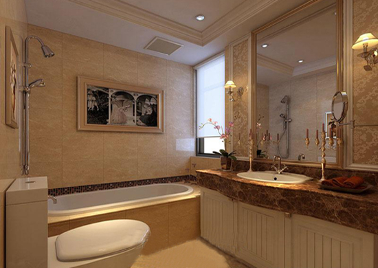 歐式風(fēng)格的家居要用家具及軟裝飾來營造一個房間內(nèi)的整體效果,衛(wèi)生間可不例外。古典歐式衛(wèi)生間的設(shè)計主要是以淺色為主,深色的為輔,墻面外包花紋瓷磚,與深色的臺面形成對比,讓衛(wèi)生間整體給人的感覺就是簡潔大方,復(fù)古時尚的歐式鏡前燈發(fā)出暖暖的鵝黃色光,浪漫又帶意境的燭臺,搭配著墻上的裝飾畫,這樣的設(shè)計,令整個衛(wèi)生間空間的感官上在絲絲浪漫情懷和點點優(yōu)雅柔和中頗感溫馨舒適,置身其中,暢享體驗歐式古典格調(diào)的唯美。