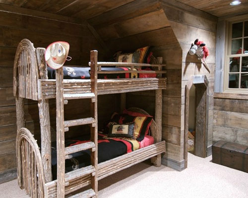 再來看看這款色設計,根據(jù)這間房屋的裝修風格,上下鋪的也選擇了木質床,原汁原味的木頭作為原材料,沒有過多的加工,讓木頭的自然紋理清晰可見,透著十足的質感,與居室內其他物件及主題風格貼合的十分緊密。床品的選擇也很適合。走進這樣一間,仿佛進入了樹屋中一樣,一切都是那么的純樸自然,別有一番滋味。