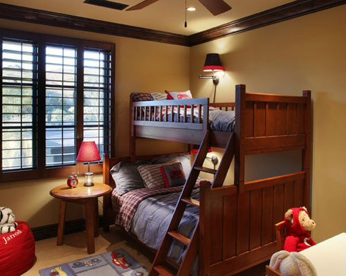 最后看看這款造型設計,純實木打造的雙層床,看著就硬朗結實,深木色的顏色,很有質感,格子布的床品很適合運用在深木色不床上,與房間的木質窗,木質小圓桌等相協(xié)調。在暖暖的燈光映射下,帶給人一種安靜閑適的田園風情。