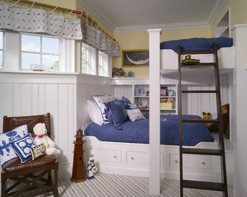 看看這風格,藍色與白色的完美結合,營造出的是風輕云淡的愜意之感。白色簡約的床體設計,即使在這樣看著并不怎么寬敞的空間中這種雙層床也并沒有讓人感覺到擁擠。做工精細的布藝,恰當好處的色彩搭配比例,洋溢著濃濃的自由愜意之感。