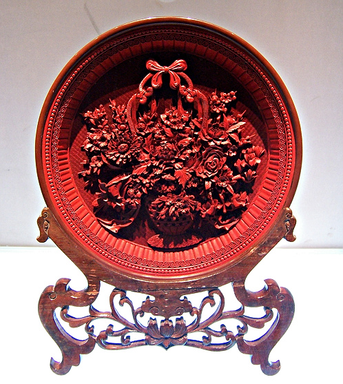 接下來才被稱為第二步,即雕填工藝,制作時(shí)先把設(shè)計(jì)好的裝飾圖稿拷貝到胎體上,接著用刀雕出陰刻的畫面,陰刻是古時(shí)和陽刻對立的雕刻手法,就是刻畫面、文字以外的部分,而后凸出來的就是所要表現(xiàn)的文字或畫面,所以古時(shí)稱凹陷下去的為陰刻(陰字、陰畫)。凸出來的為陽字、陽畫。陰刻完好后才用小牛角刀把調(diào)好的彩漆刮入陰紋中(凹陷內(nèi)),然后再進(jìn)行研磨,即打磨等工序、工藝。