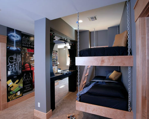 再來(lái)看看這款設(shè)計(jì),整間房屋的色調(diào)給人感覺較為硬朗。上下鋪的設(shè)計(jì)摒棄了以往的設(shè)計(jì)理念,進(jìn)而注入了新的創(chuàng)想。采用鎖鏈吊掛的方式組成了一組上下鋪,很符合這間房屋設(shè)計(jì)的風(fēng)格。由此可能看的出,這是一款很適合家有男孩子的家庭使用。