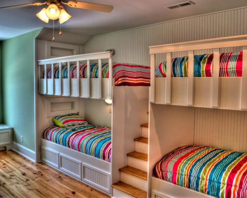 彩虹樣式的床品搭配白色的雙層床,新穎又時(shí)尚,讓人看了就心情大好。木制的地板及臺(tái)階可很符合這間屋子的整體感覺。想象一下要是學(xué)校的宿舍能裝修成這個(gè)樣子是不是很有愛呢。
