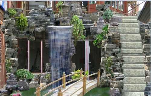 用山石做卷邊處理,雖然不太符合自然物象,但是只有這樣才能確保瀑布沿著墻體、山體比較平穩(wěn)地滑落下來,并且最好再作坡面處理。在進(jìn)行瀑布的設(shè)計(jì)和建造中,還必須事先確定好瀑布的水量,這樣更有助于讓瀑布產(chǎn)生最佳的視覺、聽覺效應(yīng),因?yàn)樗看舐洳畲?,水聲更響,氣?shì)更壯觀,而如果是水量小,落差大卻讓瀑布失去了真正的內(nèi)涵,難以激起人們的興致,反而會(huì)人們失落很多。