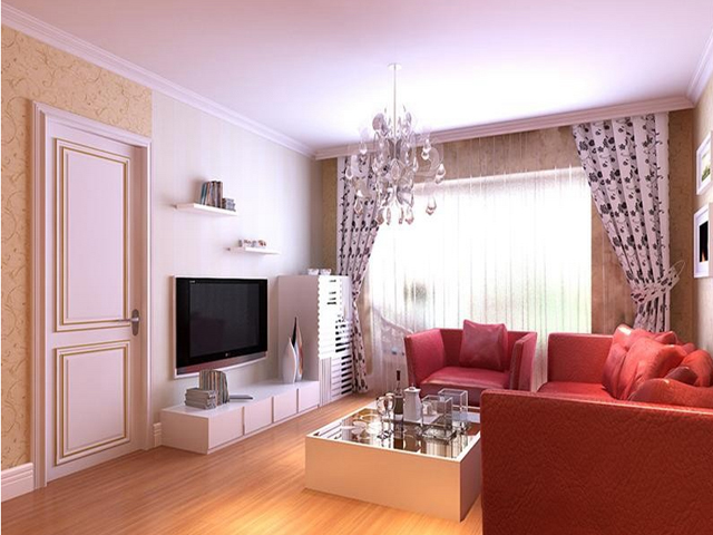 素雅大方的電視背景墻設(shè)計(jì),白色壁架裝飾,一門為界線,旁邊墻面均有淺黃色花紋墻壁紙鋪貼,色彩對(duì)比較明顯,空間功能性區(qū)域劃分明顯,界線清晰。白色簡(jiǎn)約電視柜搭配,純色花瓶裝飾,整個(gè)背景墻看上去清新淡雅。石膏板吊頂,晶瑩閃亮的水晶吊燈懸掛在客廳吊頂中央,白色木質(zhì)頂角線裝飾。淺黃色花紋墻壁打造的沙發(fā)背景墻,裝飾畫裝飾,美觀大方;鸺t的皮質(zhì)簡(jiǎn)約沙發(fā),紅色靠包及靠枕裝飾,配套的沙發(fā)椅搭配,點(diǎn)亮的了家居色彩,補(bǔ)充了居室藝術(shù)氛圍,給居室打來了一抹亮麗的色彩,同時(shí)也充分體現(xiàn)出了現(xiàn)代簡(jiǎn)約風(fēng)格的特點(diǎn)。實(shí)木復(fù)合地板鋪地,白色方形茶幾,玻璃鏡面桌面設(shè)計(jì),簡(jiǎn)潔時(shí)尚。整個(gè)家居給人的感受,溫馨舒適、時(shí)尚個(gè)性。